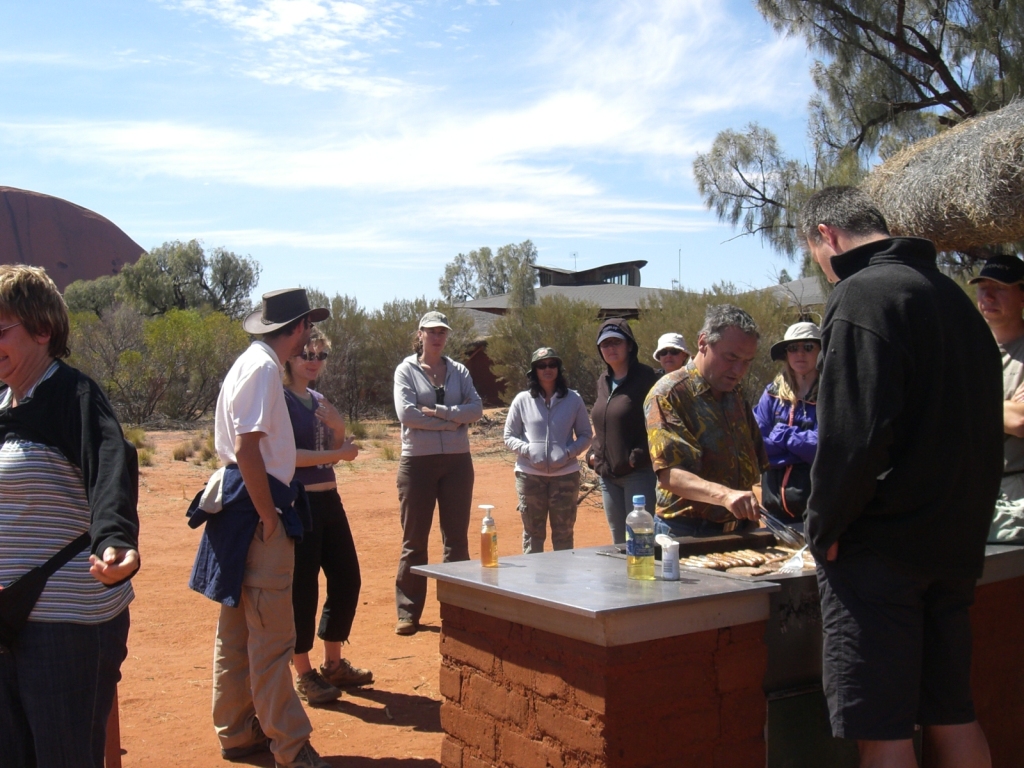 Nach einem Tag voller Staub, Sonne und Abenteuer machten wir am Nachmittag ein kleines Überlebenstraining im Outback. Unser Guide zeigte uns, wie man essbare Pflanzen erkennt – und sogar, wie man nach Raupen gräbt, die tief im Wüstensand leben.
