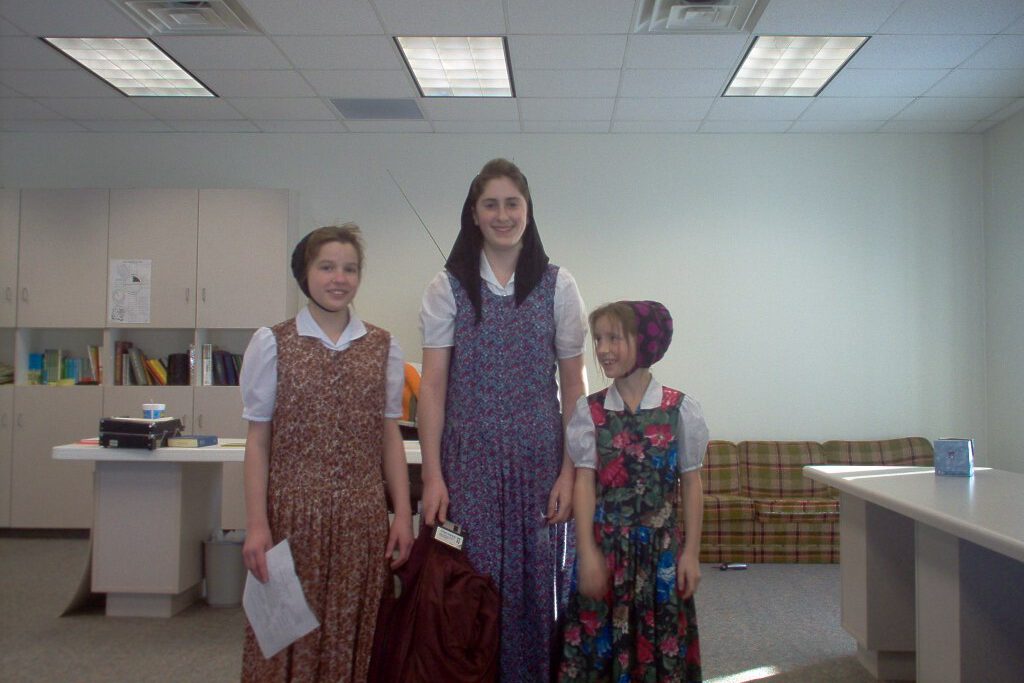 In einem der schlichten Gebäude der Kolonie in der Nähe von Aberdeen standen drei Mädchen nebeneinander – zwei Jugendliche und ein kleines Kind. Alle drei in den typischen hutterischen Kleidern, die dunkelblauen Kopftücher sorgfältig gebunden. Ihr Anblick wirkte wie eine Brücke durch die Zeit: dieselben Schnitte, dieselben gedeckten Farben, wie sie schon ihre Urgroßmütter getragen hatten.