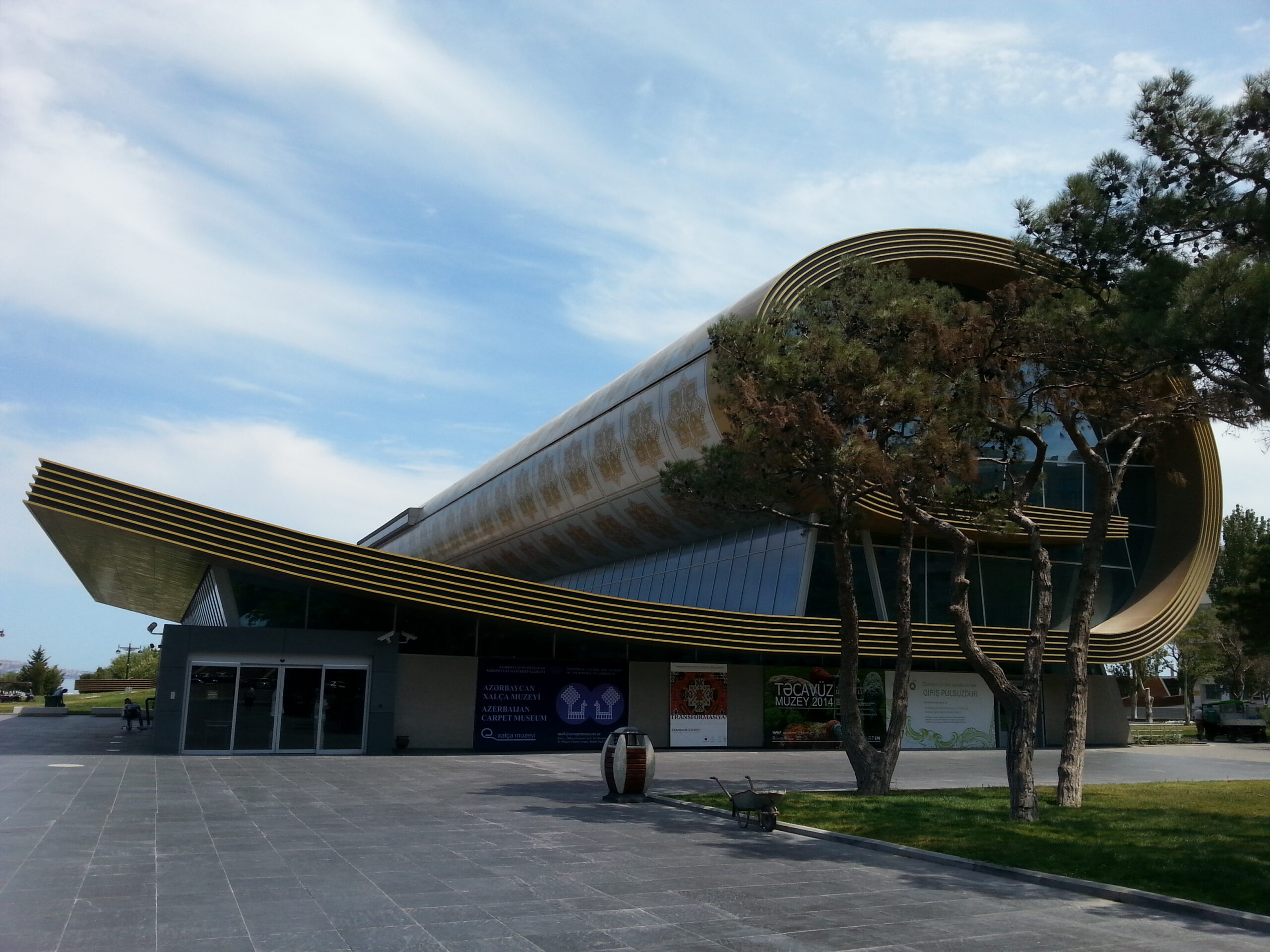 Das Teppichmuseum – ein langgezogenes Gebäude, das sich wie ein aufgerollter Teppich aus Glas und Metall über die Uferpromenade legt.